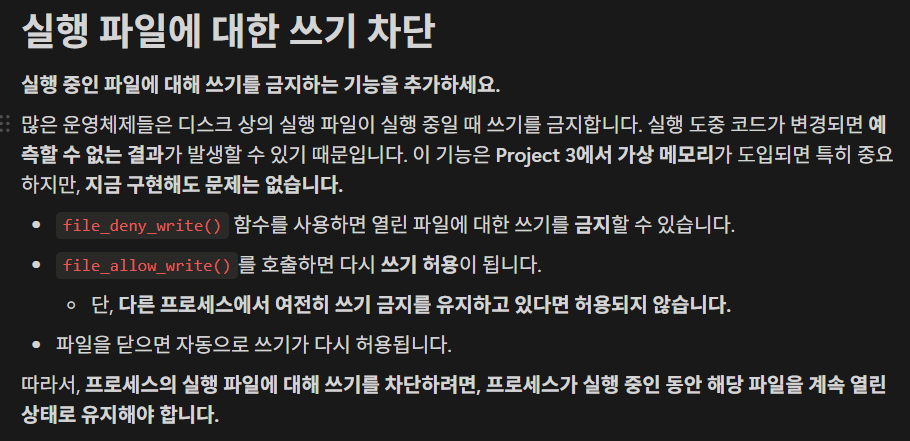 자신의 파일에 write를 못하도록 막으려면 어떻게 할까? file마다 bool 변수 같은것을 둬서 확인한 다음 막아주면 되지 않을까? 이러한 로직이 이미 pintos 내에는 구현되어 있다. 사실 굉장히 친절한 과제인 것 같다.