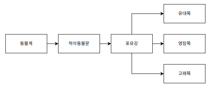 위 그림처럼 상속 관계가 이어져 있다고 가정하자. 동물계가 최상위 클래스고 유대목, 영장목, 고래목이 최하위 클래스이다.
