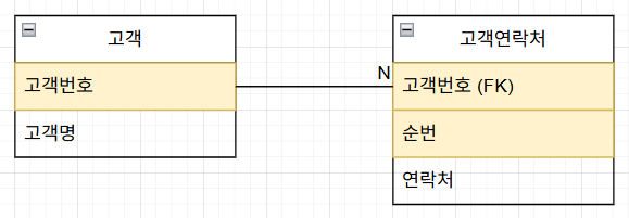 이를 분리하여 하나의 컬럼에는 하나의 속성만 갖게 하는것이 제 1 정규형이다. 고객 테이블을 고객과 고객연락처로 분리해보자.