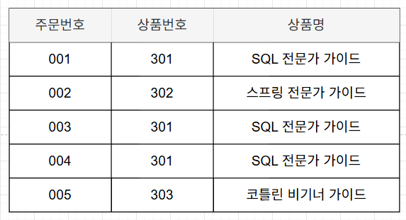 위의 정규화 이후 주문상세 테이블에 다음과 같이 데이터가 저장돼있다고 하자.