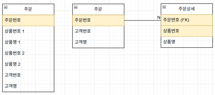 이를 정규화하여 주문과 주문상세로 두면? 각 주문에 상품이 몇개가 들어가든 상관이 없다.